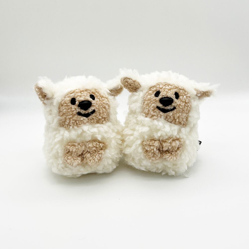 やさしいふわふわのひつじさん。綿毛のように白いアルパカボア風生地のボディと、ピンとしたお耳がポイントです。
