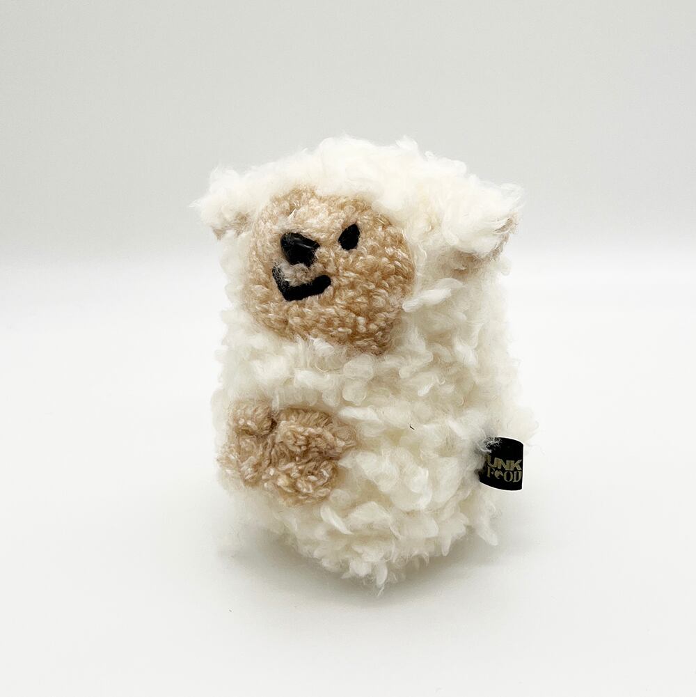 やさしいふわふわのひつじさん。綿毛のように白いアルパカボア風生地のボディと、ピンとしたお耳がポイントです。